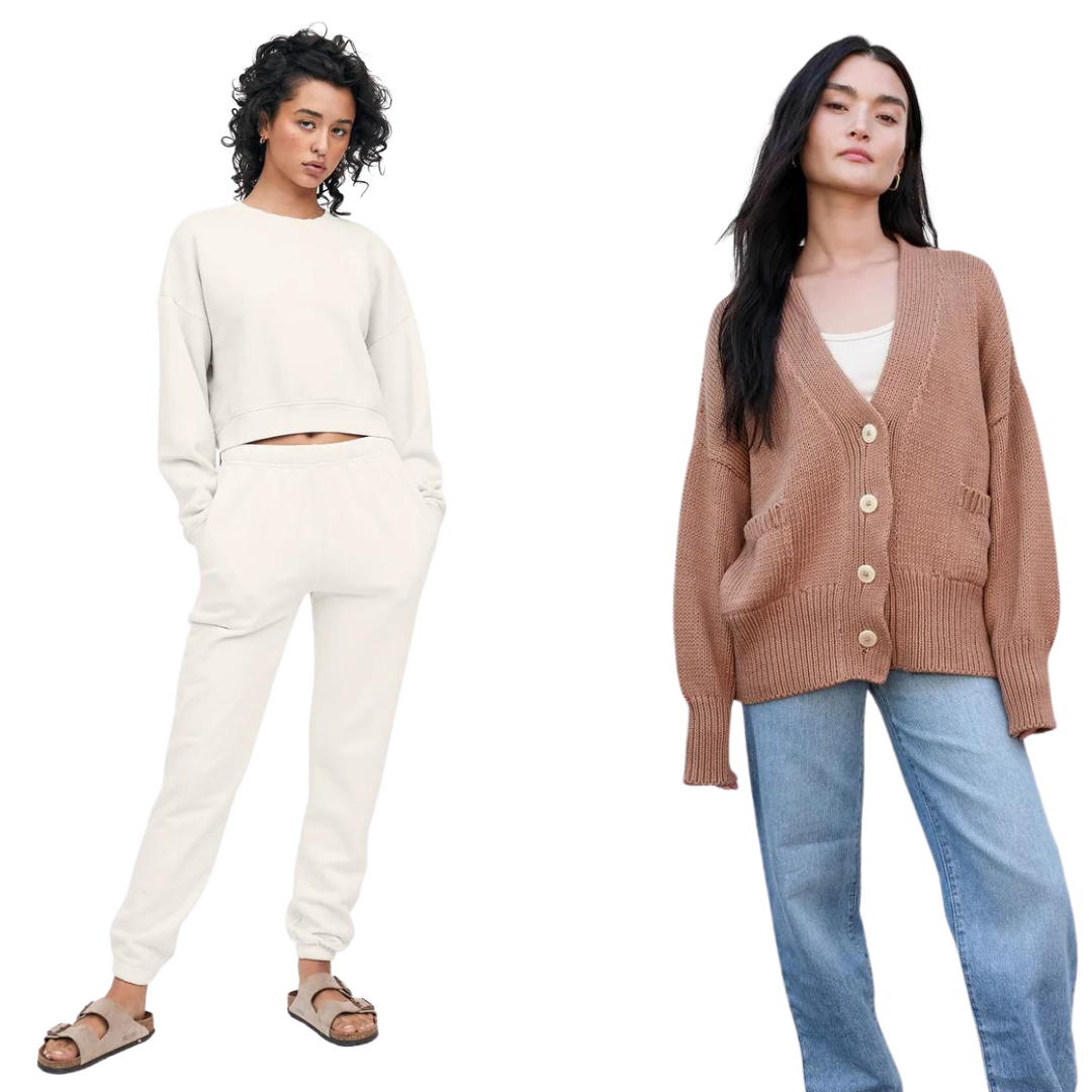 100% Organic Cotton fashionable clothing, loungewear, athletic wear, and undergarments (for men and women). Faves are the sports bras, cozy sweaters, hoodies and sweatpants.