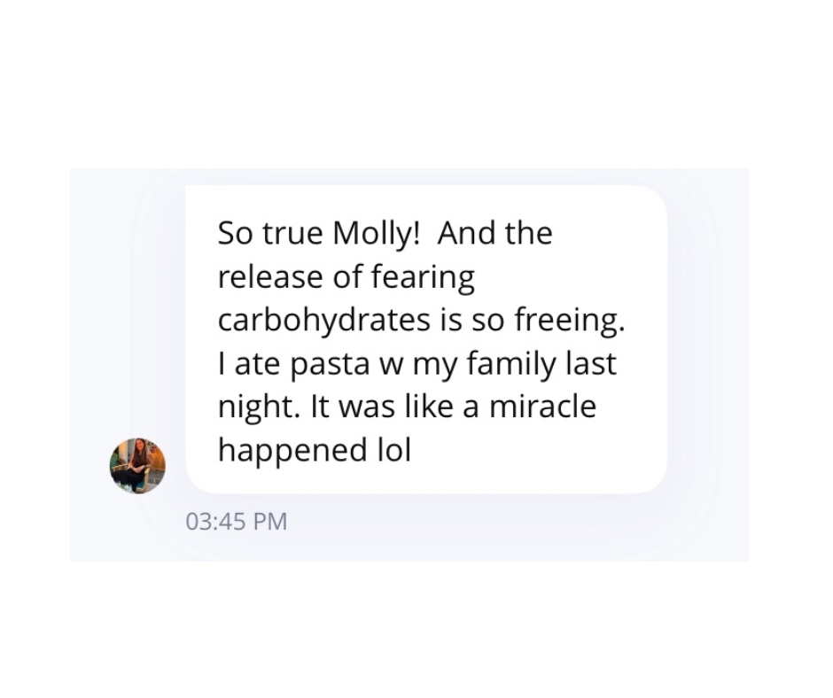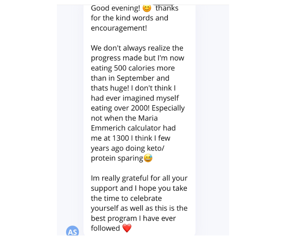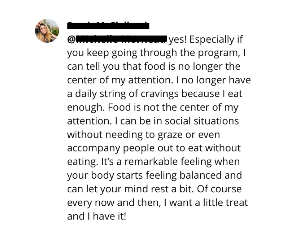 "I'm down 20 pounds from the start of this program and Iâm eating more than I ever have intentionally. I realized that the food I was eating wasnât the problem, it was the balance of what I was eating that was. My relationship with food has healed."