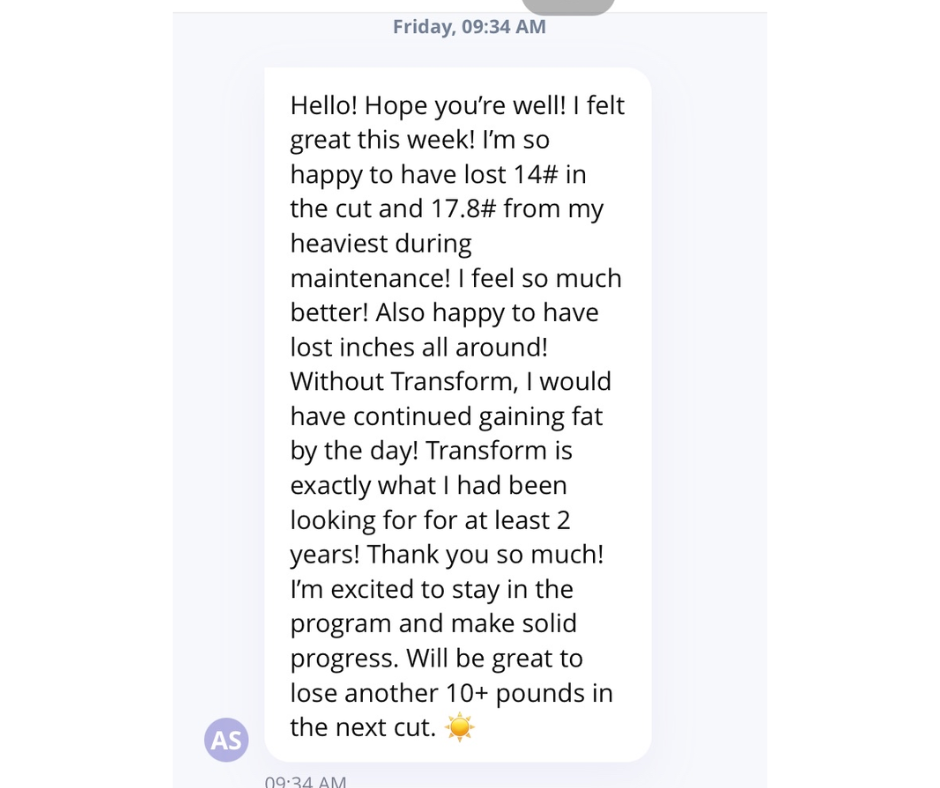 "I'm so happy to have lost 14 lbs in the cut, and 17.8 lbs from my heaviest. Also happy to have lost inches all around! Without Transform, I would have continued gaining fat by the day! Transform is exactly what I had been looking for for at least 2 years."Â
